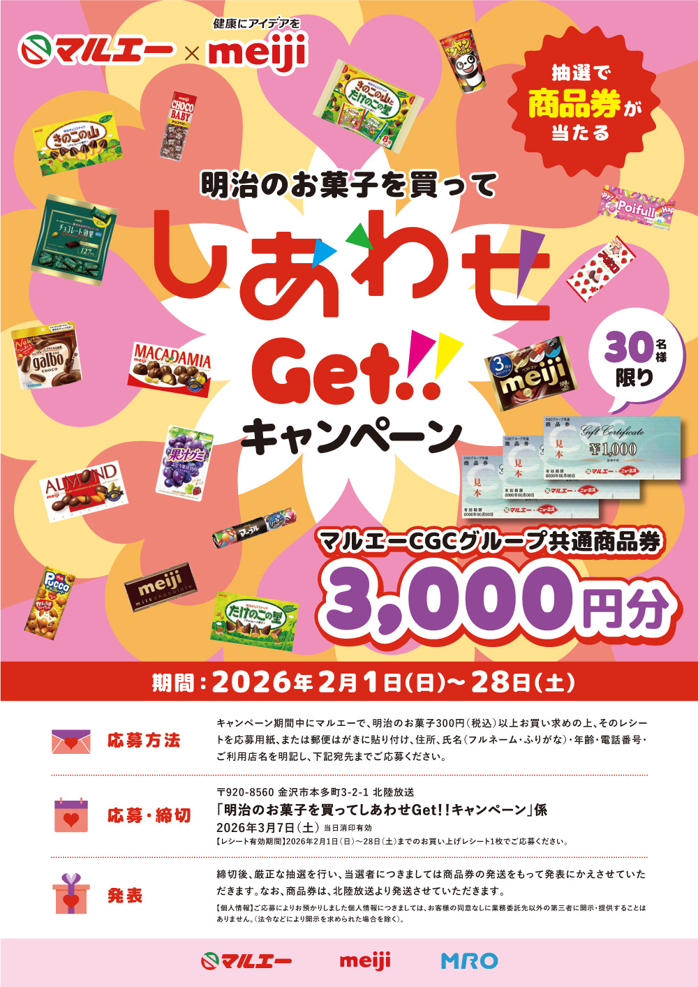 マルエー > イベント情報 > 「マルエー×meiji×北陸放送共同企画 明治のお菓子を買ってしあわせGet!キャンペーン」のご案内