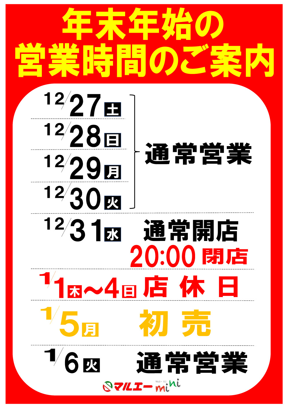 マルエーmini各店 年末年始の営業時間のご案内