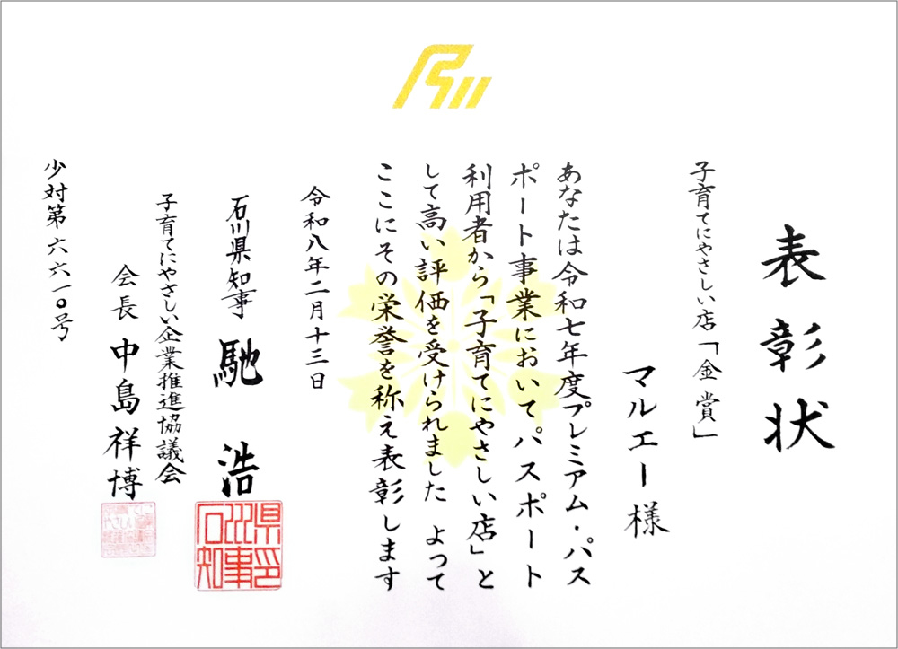 マルエーは、この度プレミアム・パスポート優良協賛企業として「子育てにやさしい店金賞」を2年連続で受賞いたしました。